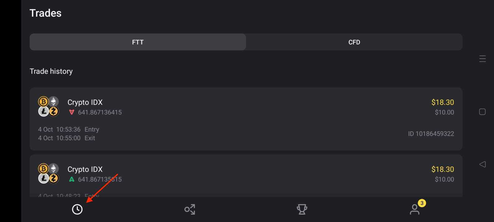 Platform ke neeche diye gaye “Clock” icon par click karein apni trade history dekhne ke liye.