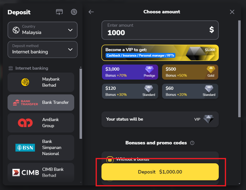 3. You can make a deposit via any of the suggested banks. Choose a bank and click “Submit”.