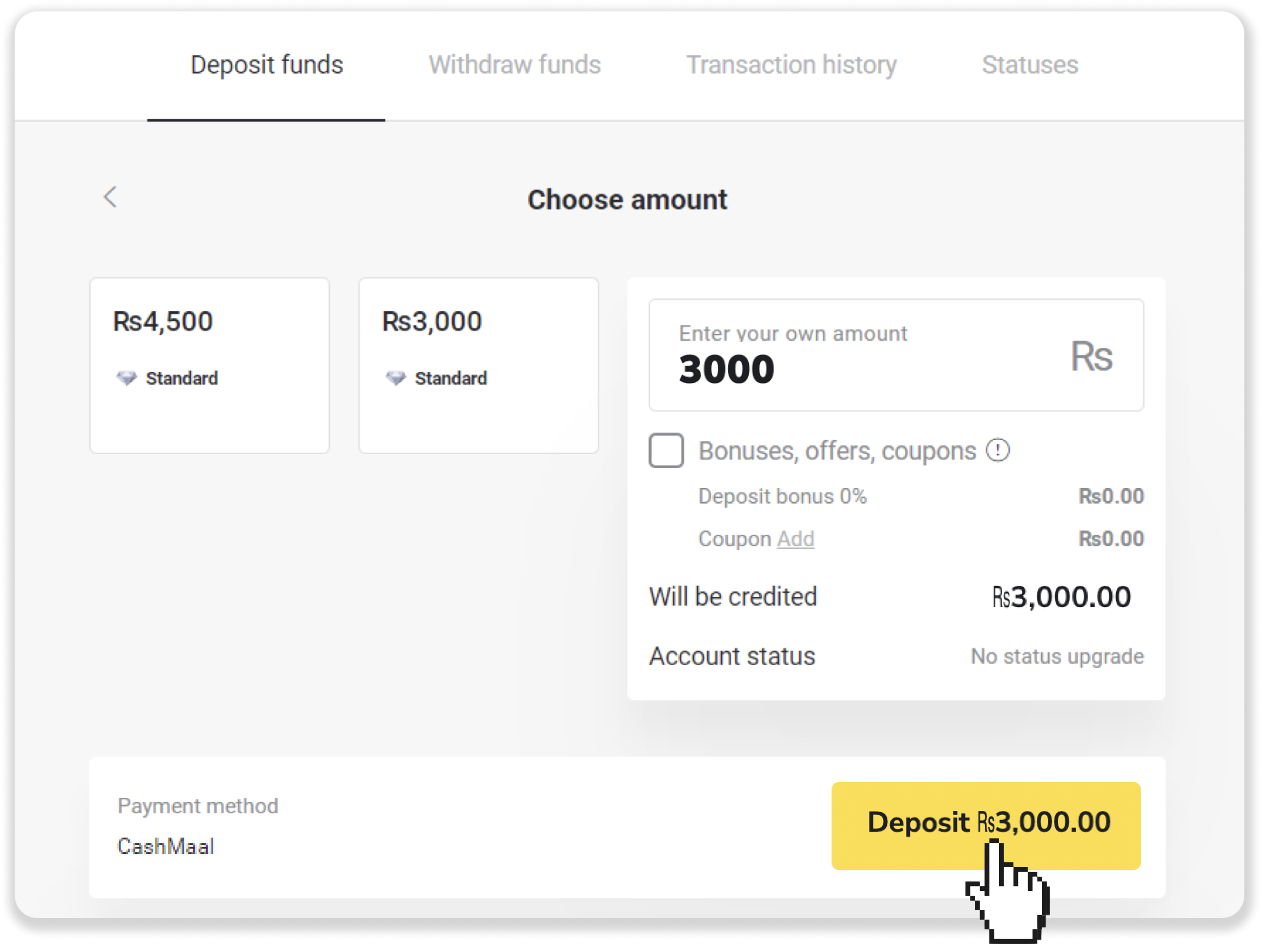 1. Go to the cashier page and choose “CashMaal” as a deposit method.