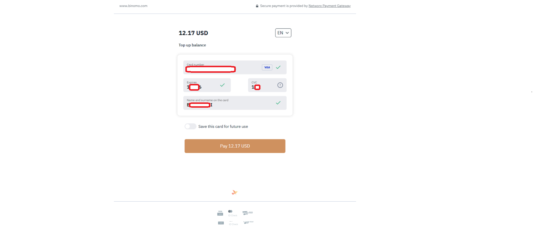Step 13 – Enter your card details on the next page and click the “Pay 12.17 USD” button.