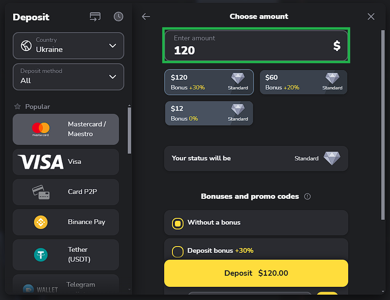 1. In the traderoom, click the “Deposit” button in the top right corner of the screen. Choose your country and the payment method you’ve decided to make a deposit with.