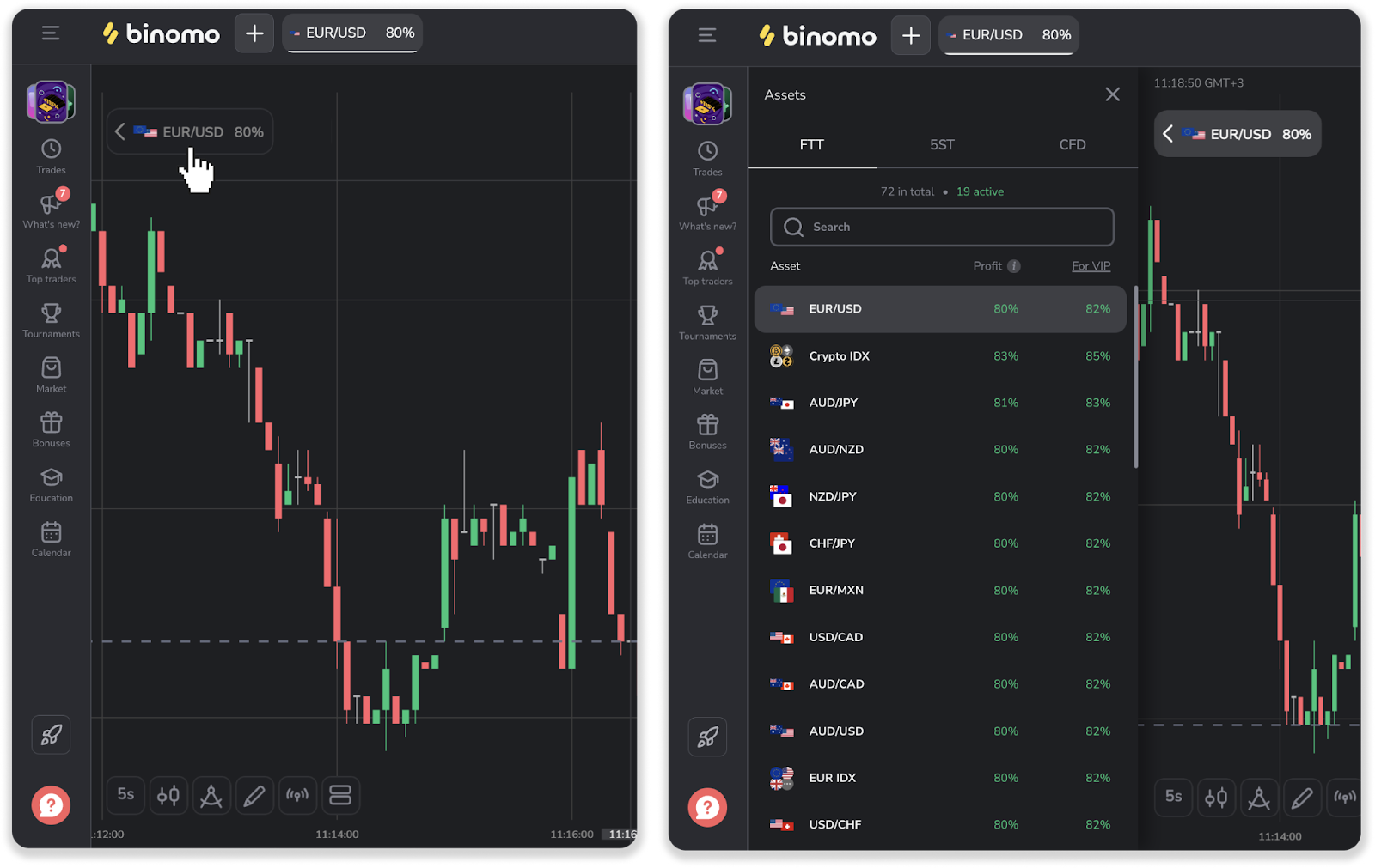 Note. You can trade on multiple assets at once. Click on the “+” button left from the asset section to pick another asset and then simply switch between tabs.
