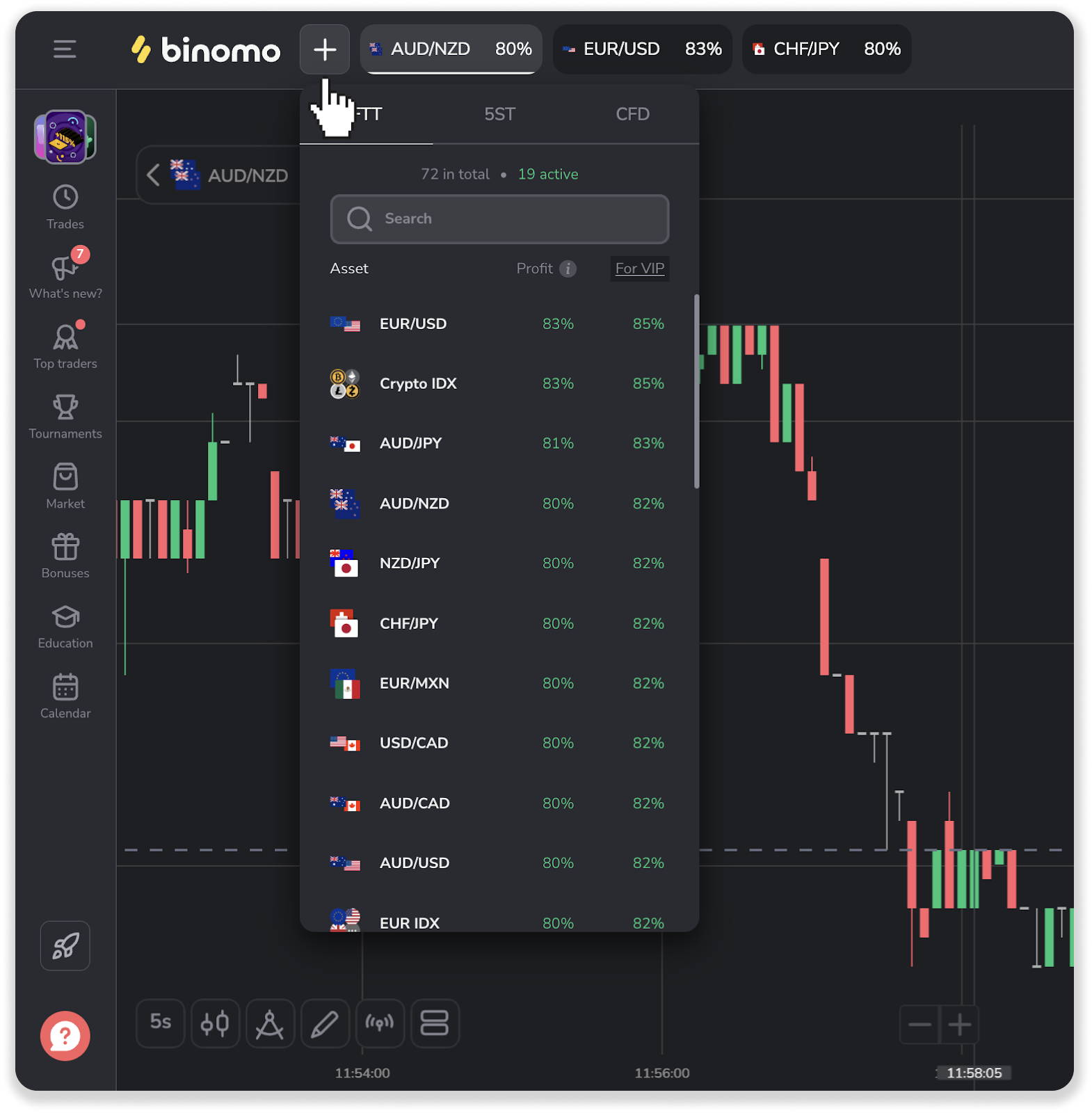 You can scroll through the list of assets to see which ones are available for your status or due to holidays and market trading hours. To pick an asset for trading — click on it.