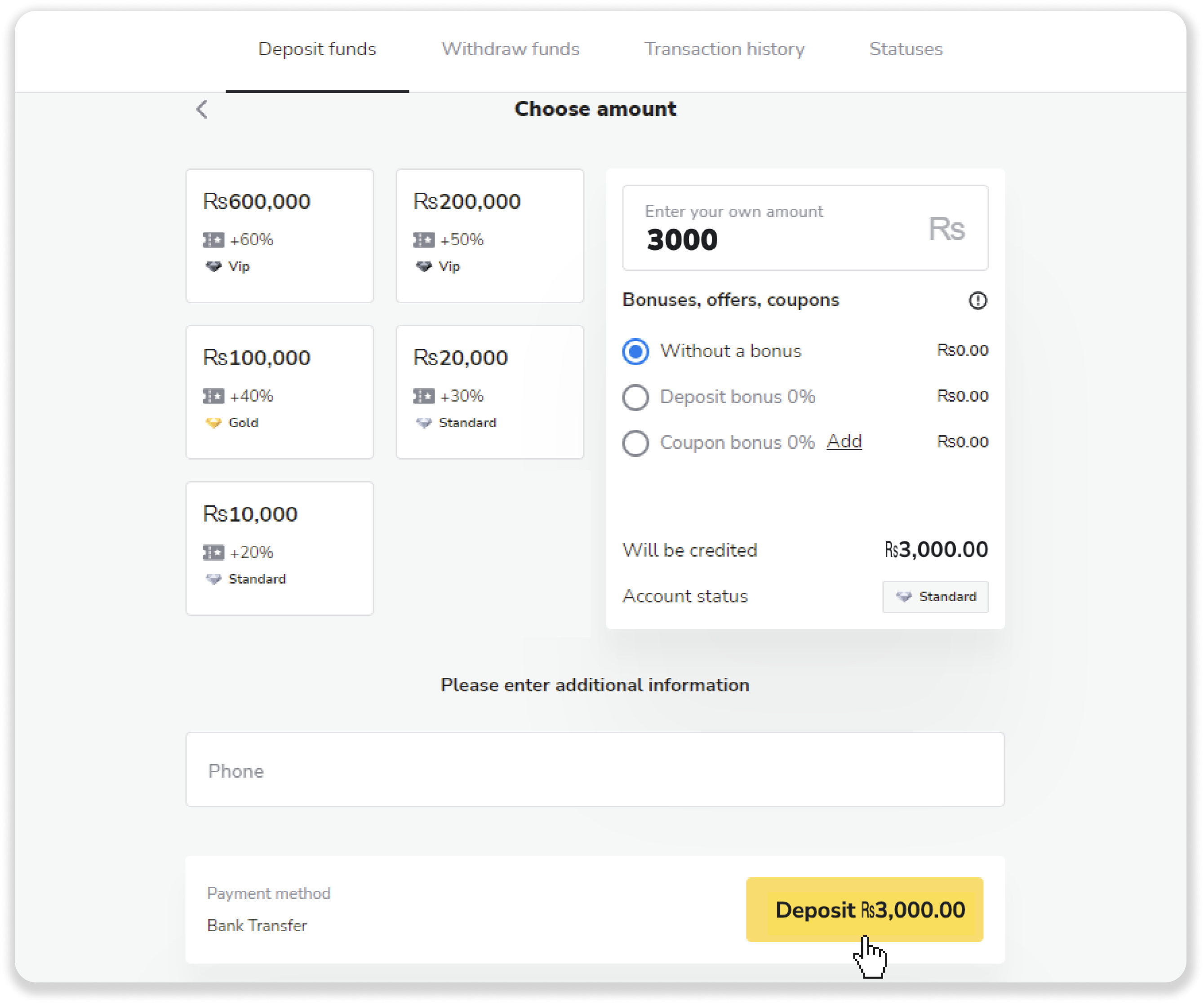Choose Pakistan in the “Country” section and select the “Bank transfer” payment method.