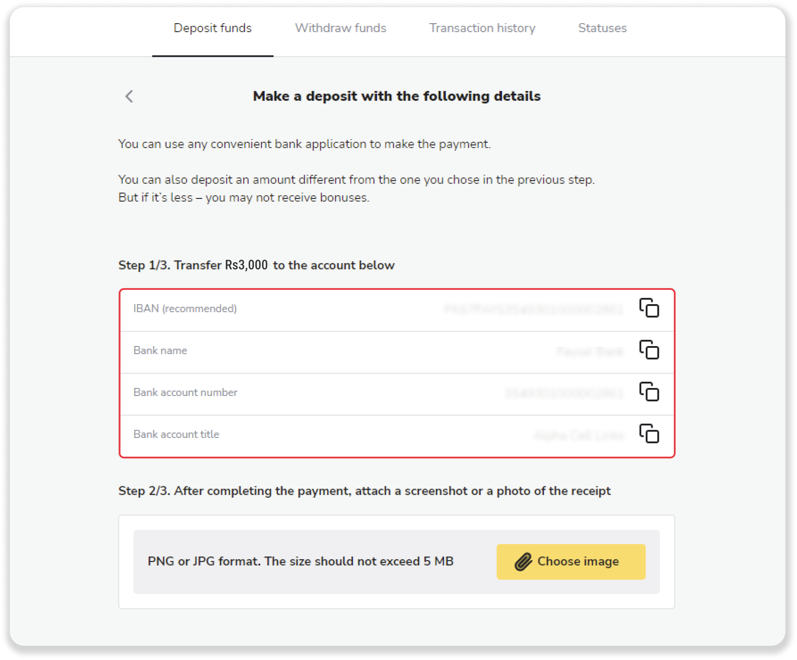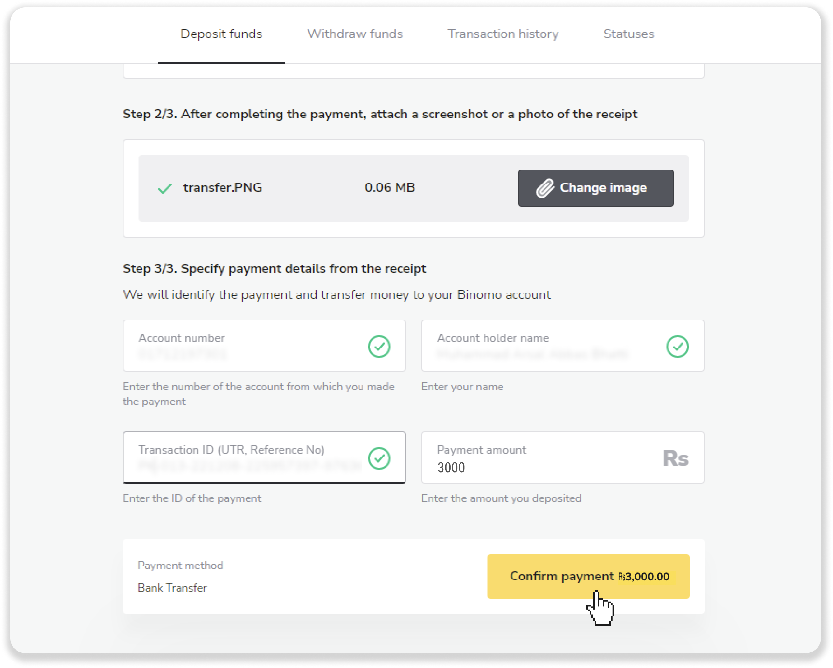 Attach the receipt and fill in the required fields — your account number, your name, transaction ID, and the amount you’ve deposited. Click “Confirm payment”.