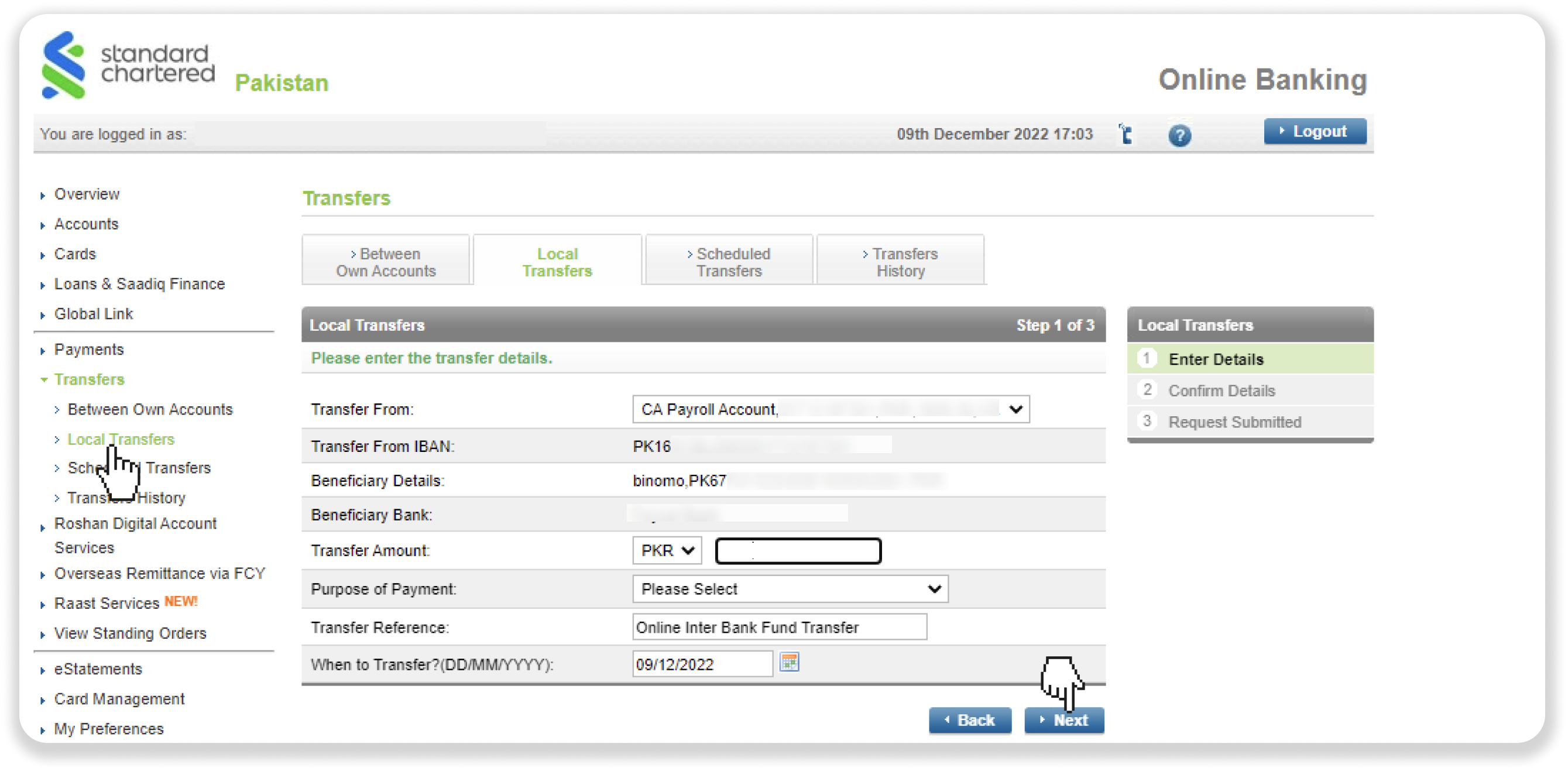 Go to the “Transfer funds” menu, choose the beneficiary you’ve added on step 7, and enter the amount you want to deposit. Click “Next”.