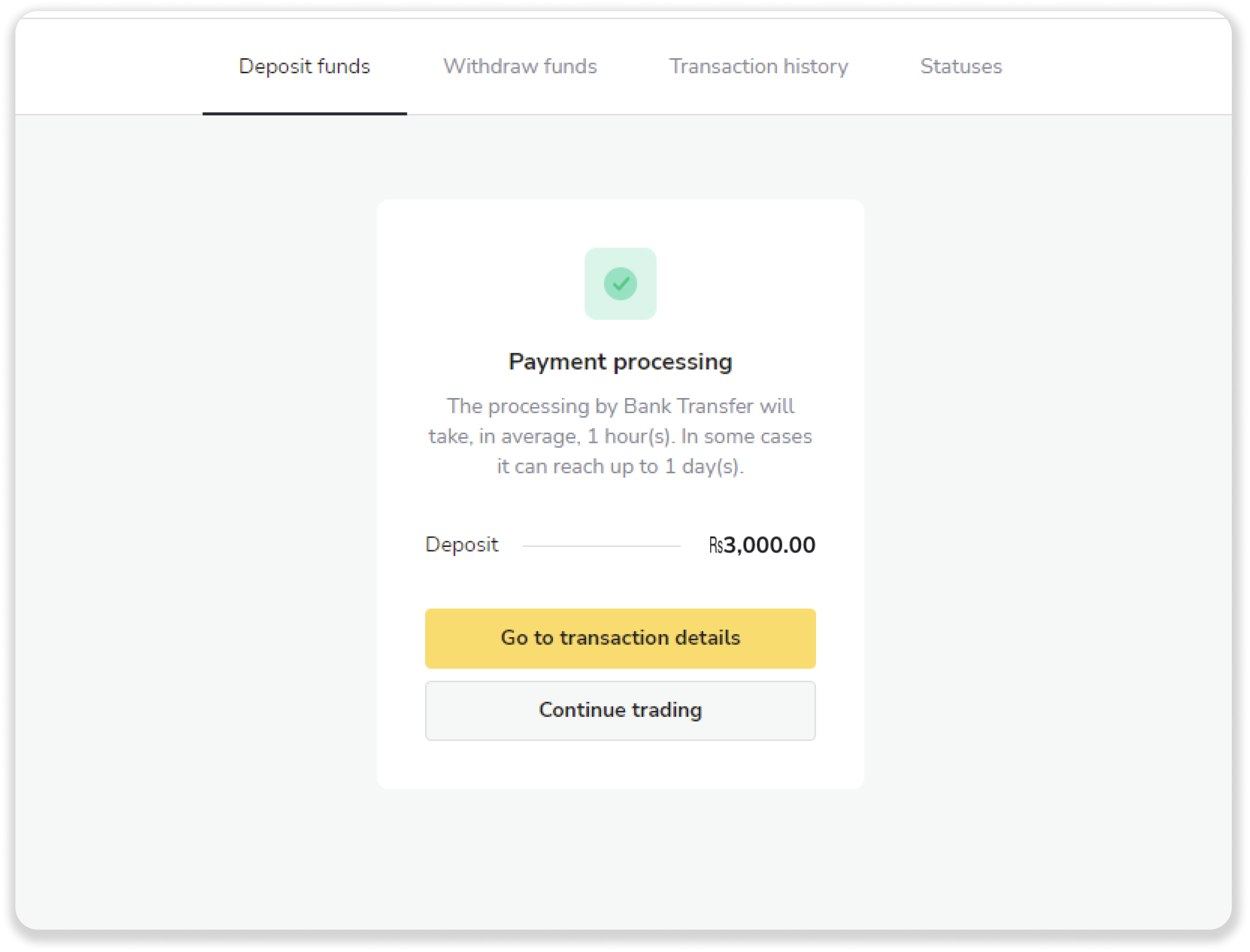 You can check the status of your transaction on the “Transaction history” tab on Binomo.