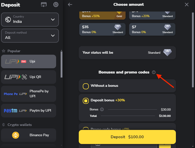 You can find more information about bonuses when making a deposit. Click on the exclamation point.