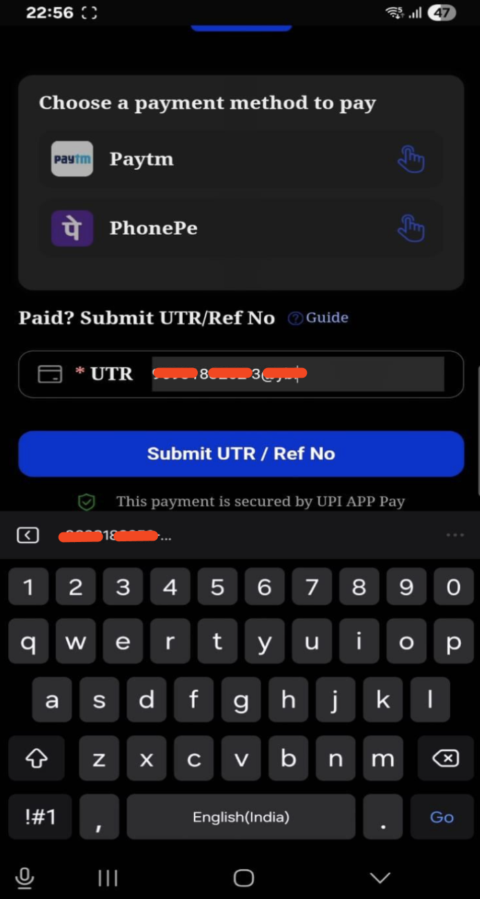 13. Once payment done enter the transaction reference number in “UTR” field and click on “Submit UTR/Ref No” button: