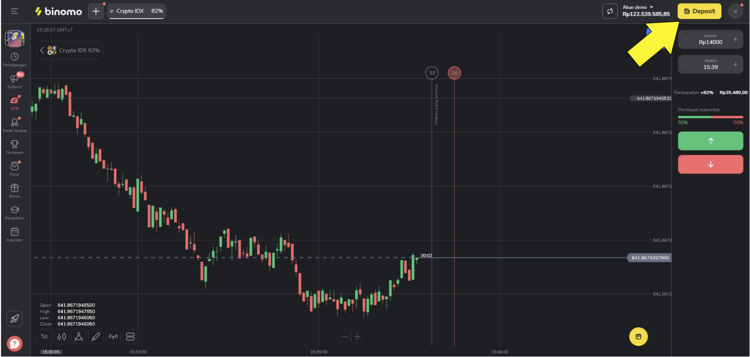 - Di ruang perdagangan, klik tombol "Deposit" di sudut kanan atas layar.