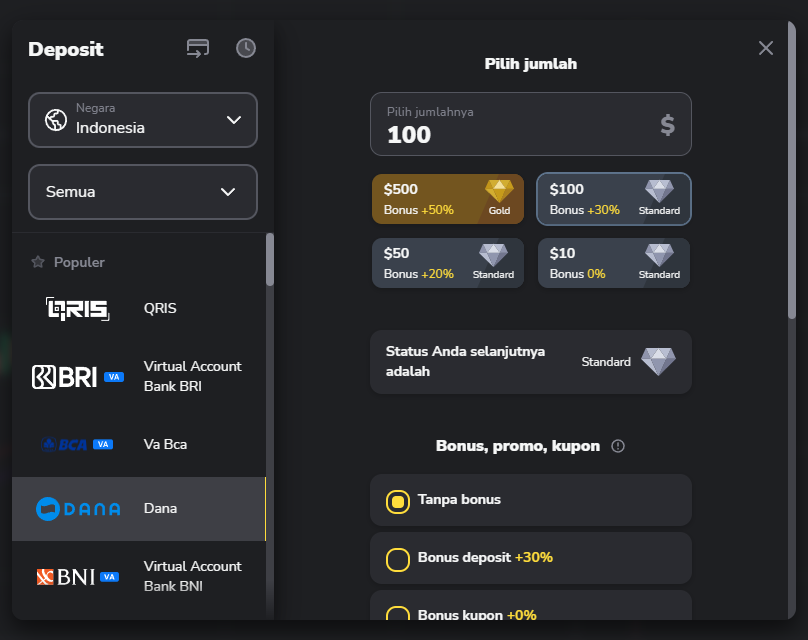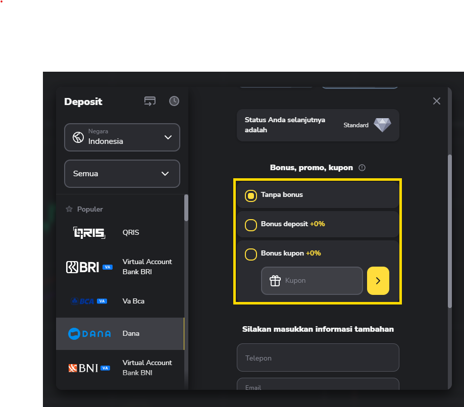 4. Jika Anda ingin melakukan deposit dengan bonus, klik pada salah satu pilihan di bawah.