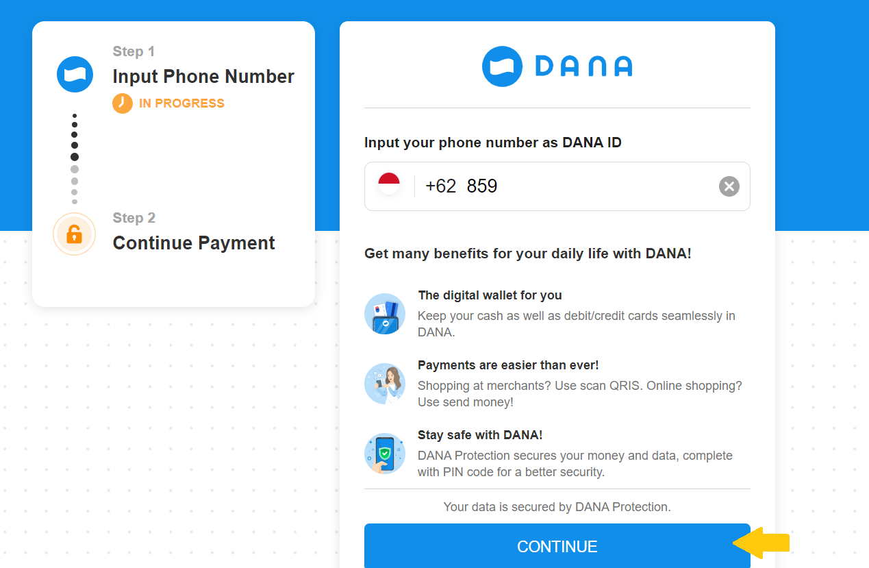 6. Masukkan nomor DANA Anda, kemudian klik pada tombol “lanjut/continue”.