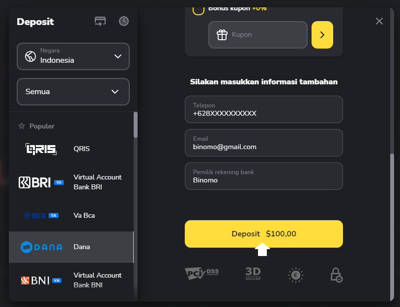 5. Masukan informasi tambahan, seperti nomor telepon (harus dalam format internasional), alamat email dan nama pemilik rekening DANA. Apabila semua data sudah dimasukkan dengan benar, klik pada tombol Deposit berwarna kuning.