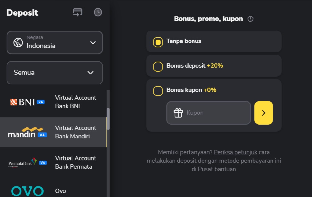 2. Pilih Indonesia dalam kolom “Negara” dan pilih “Virtual Account” sesuai dengan rekening bank yang Anda miliki. Dalam instruksi ini, kami menggunakan contoh Virtual Account Bank Mandiri.