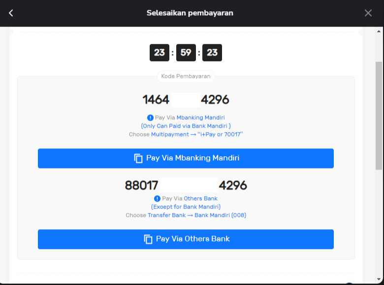 6. Anda akan dialihkan ke halaman pembayaran. Catat atau salin nomor Virtual Account dan selesaikan pembayaran di aplikasi perbankan Anda.