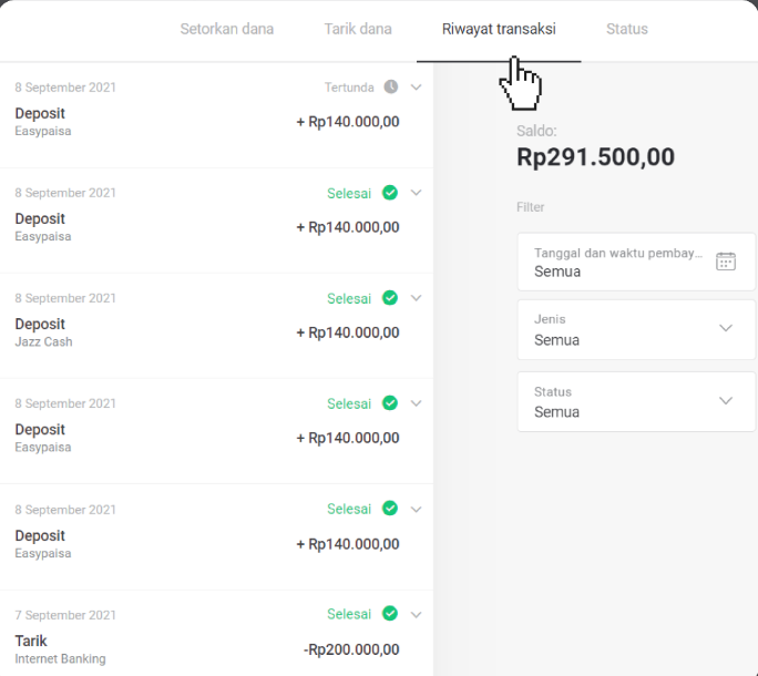 Saat Anda melakukan deposit, deposit akan diberi status "Tertunda". Status ini berarti bahwa penyedia pembayaran sedang memproses transaksi Anda. Setiap penyedia memiliki periode pemrosesan sendiri.