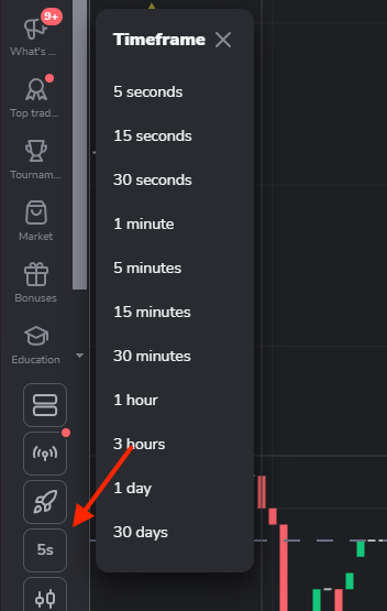 - «Шам» және «Баған» графиктері үшін ең аз шеңбер 5 секунд, максимум – 30 күнді құрайды. Ол 1 шам немесе 1 баған пайда болған кезеңді көрсетеді.