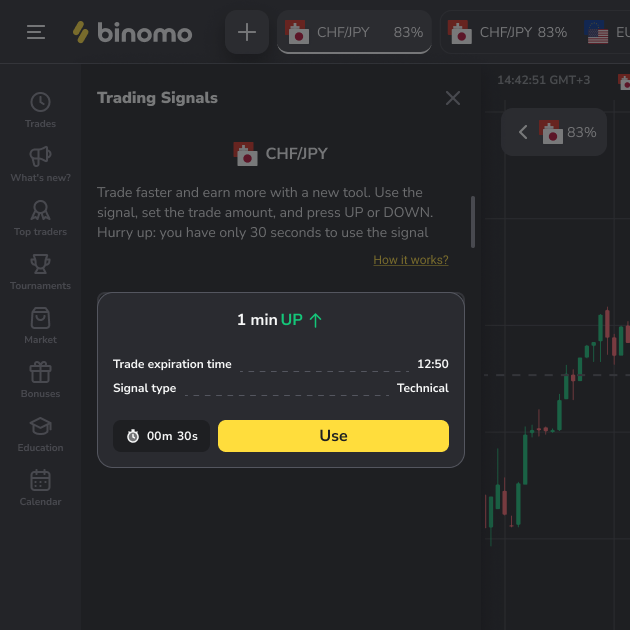 Наразі Торгові сигнали є лише в настільній версії Binomo. Щоб увімкнути його, перейдіть на нову версію графіка. Стара версія не підтримує його, оскільки вона не може забезпечити найкращий досвід торгівлі.