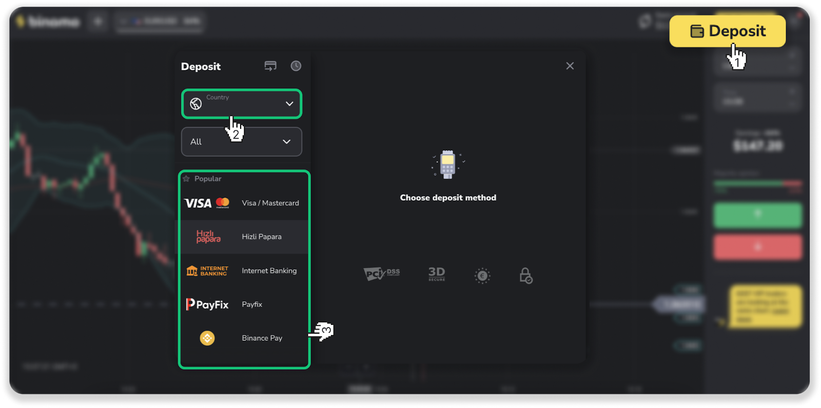 1. У трейдрумі натисніть кнопку «Поповнити» у правому верхньому кутку. Виберіть вашу країну, а потім метод, з яким вирішили зробити депозит.