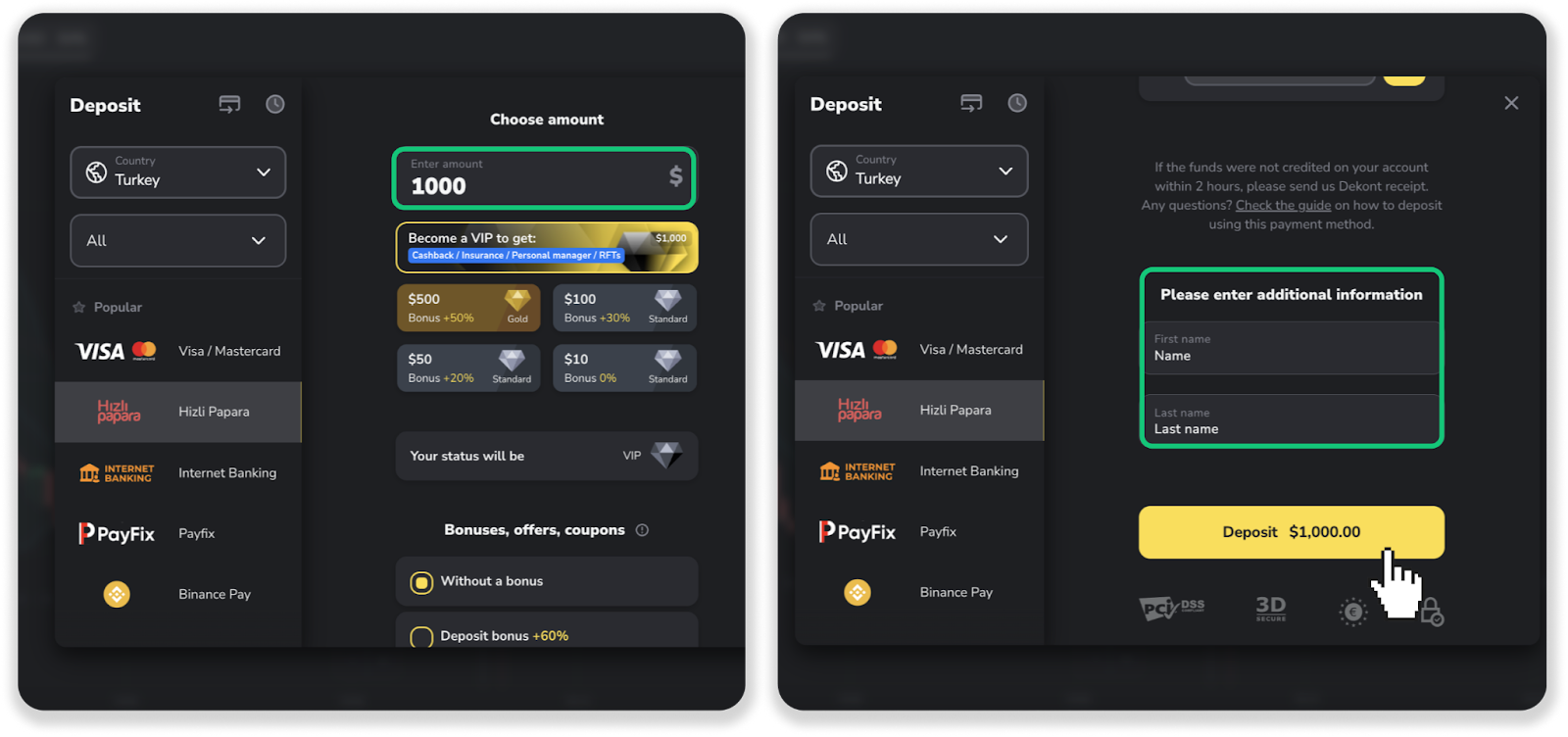 Trong phòng giao dịch, nhấp vào nút “Nạp tiền” ở góc trên bên phải của màn hình. Chọn quốc gia của bạn và phương thức thanh toán bạn đã quyết định sử dụng để nạp tiền.